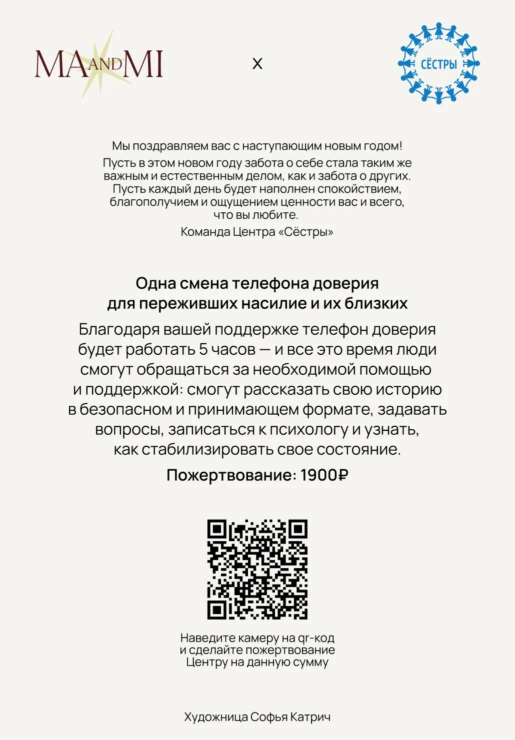 Благотворительность не должна быть сложной или требовать больших усилий, и мы хотим, чтобы возможность помочь была доступна каждому — легко, без лишних шагов, прямо во время визита в студию. Одна открытка, одно пожертвование, одна минута внимания — и чье-то желание может исполниться.